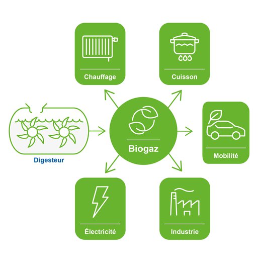 6. Utilisation : Le biogaz est ensuite utilisé en fonction des besoins, c'est-à-dire pour le chauffage, la cuisson, la production d’électricité, les procédés industriels ou comme carburant.